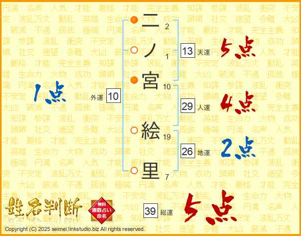 二ノ宮絵里さんの総運は39画の5点!
