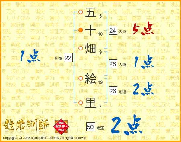五(5画)十(10画)畑(9画) 絵(19画)里(7画)