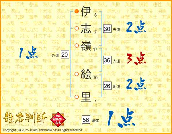 伊(6画)志(7画)嶺(17画) 絵(19画)里(7画)