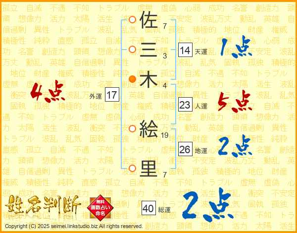 佐(7画)三(3画)木(4画) 絵(19画)里(7画)