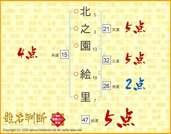 北(5画)之(3画)園(13画) 絵(19画)里(7画)