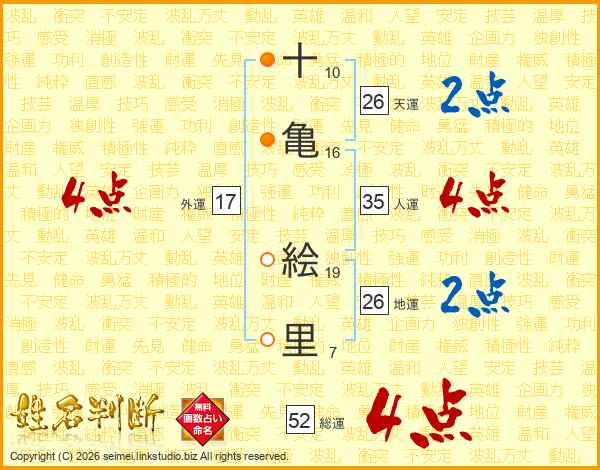 十(10画)亀(16画) 絵(19画)里(7画)
