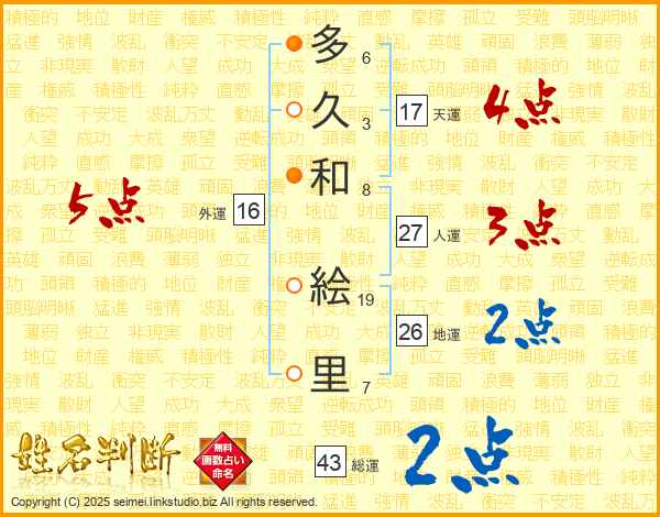多久和絵里さんの総運は43画の2点!