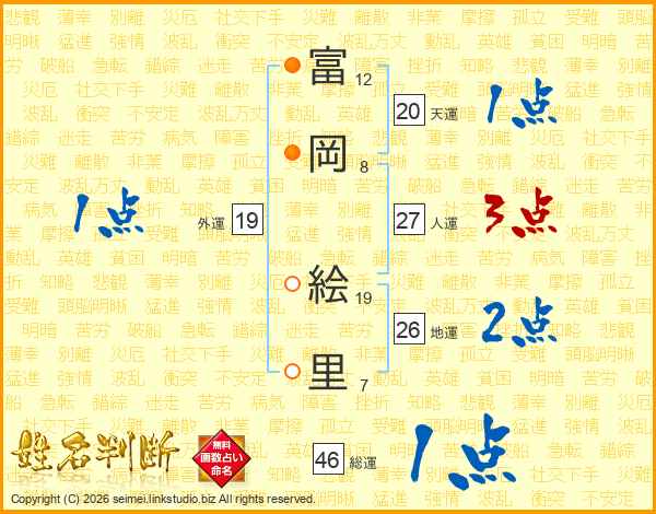 生活面を象徴する運勢です。外部から受ける影響力を表し、結婚運、家庭運や職場、環境への順応性を表します。総運から人運を引いた画数。姓や名が1文字の場合を除く。