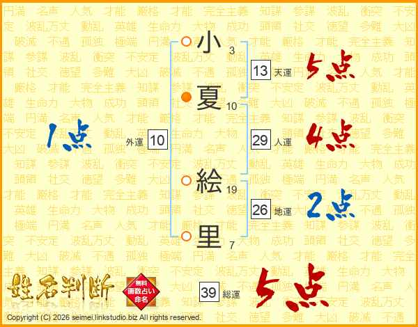 小夏絵里さんの総運は39画の5点!