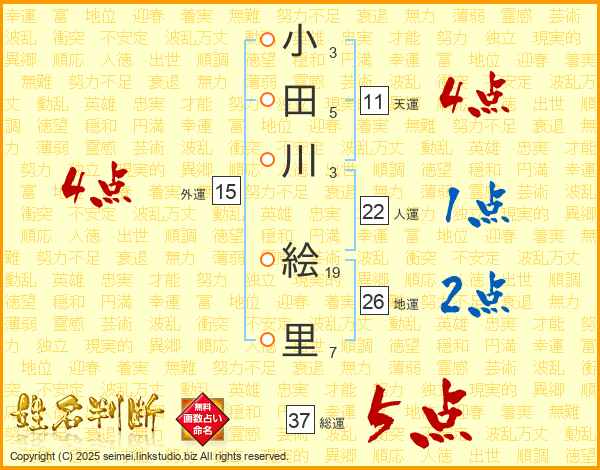 小(3画)田(5画)川(3画) 絵(19画)里(7画)