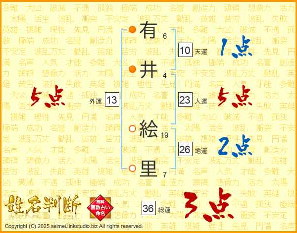 生活面を象徴する運勢です。外部から受ける影響力を表し、結婚運、家庭運や職場、環境への順応性を表します。総運から人運を引いた画数。姓や名が1文字の場合を除く。