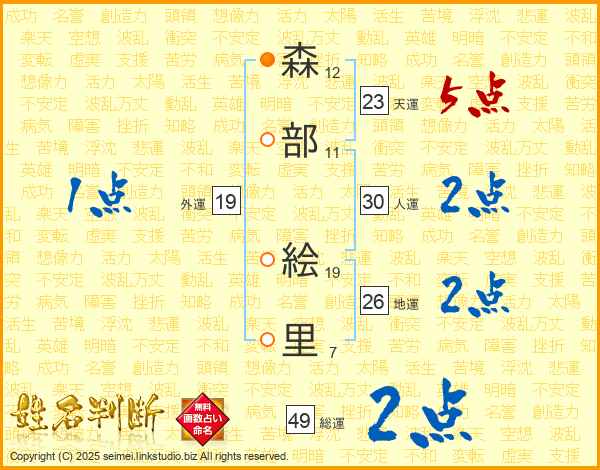 生活面を象徴する運勢です。外部から受ける影響力を表し、結婚運、家庭運や職場、環境への順応性を表します。総運から人運を引いた画数。姓や名が1文字の場合を除く。