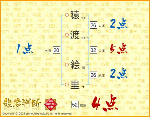 猿(13画)渡(13画) 絵(19画)里(7画)