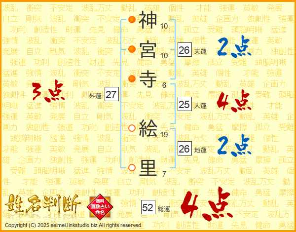 神(10画)宮(10画)寺(6画) 絵(19画)里(7画)