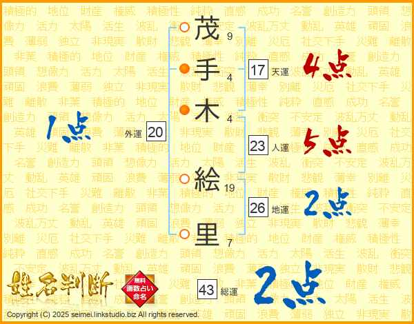 茂(9画)手(4画)木(4画) 絵(19画)里(7画)