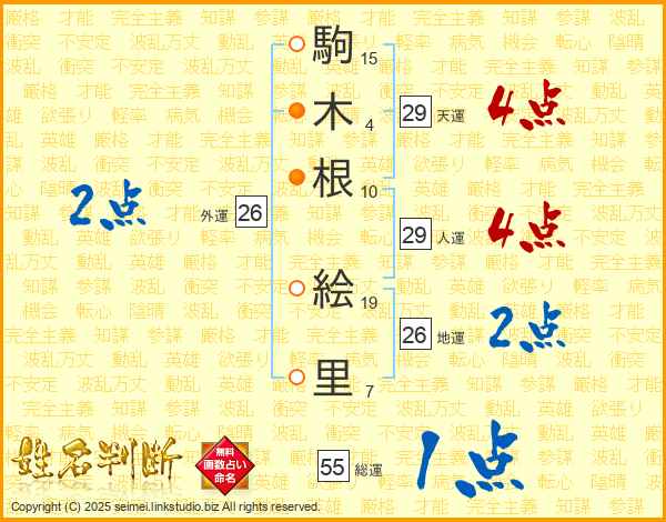駒(15画)木(4画)根(10画) 絵(19画)里(7画)