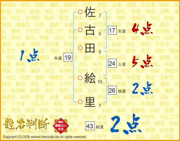 佐(7画)古(5画)田(5画) 絵(19画)里(7画)