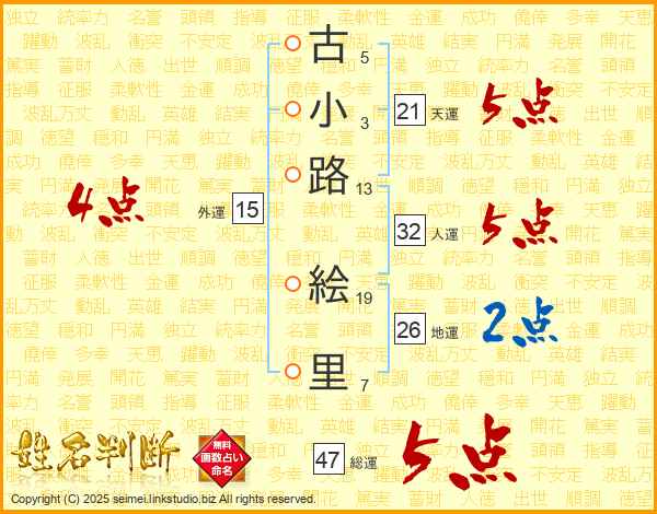 古(5画)小(3画)路(13画) 絵(19画)里(7画)