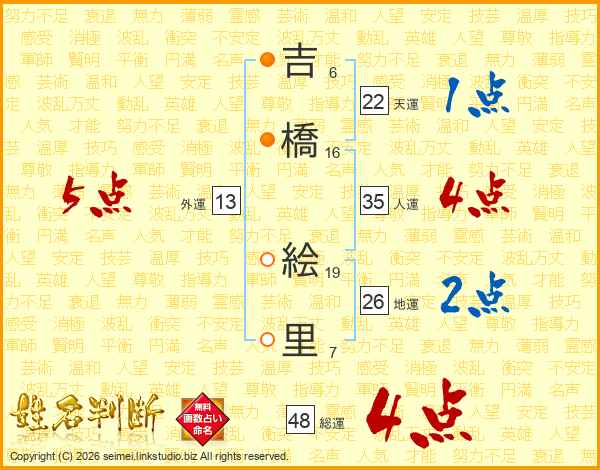 吉(6画)橋(16画) 絵(19画)里(7画)