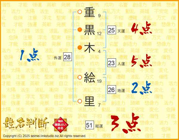 重(9画)黒(12画)木(4画) 絵(19画)里(7画)
