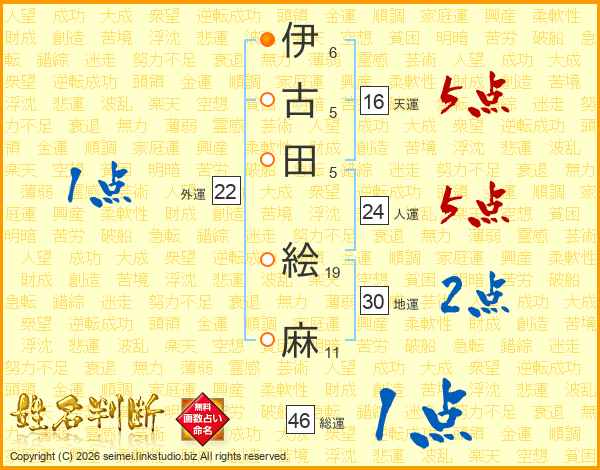 伊(6画)古(5画)田(5画) 絵(19画)麻(11画)