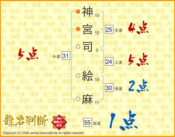 神(10画)宮(10画)司(5画) 絵(19画)麻(11画)