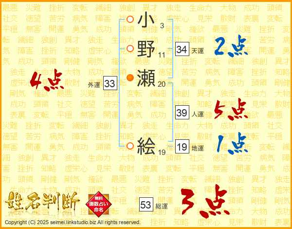 小(3画)野(11画)瀬(20画) 絵(19画)