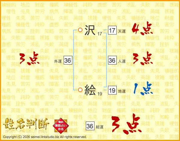 生活面を象徴する運勢です。外部から受ける影響力を表し、結婚運、家庭運や職場、環境への順応性を表します。総運から人運を引いた画数。姓や名が1文字の場合を除く。