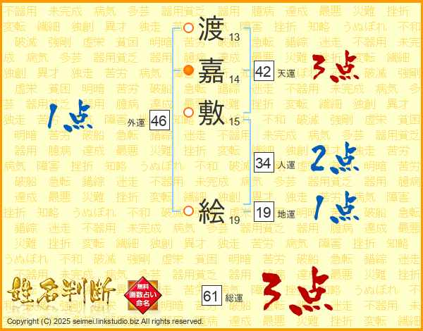 渡(13画)嘉(14画)敷(15画) 絵(19画)