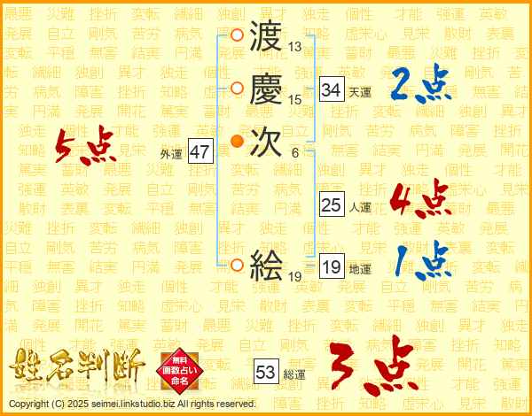 渡(13画)慶(15画)次(6画) 絵(19画)