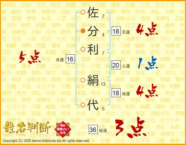 佐(7画)分(4画)利(7画) 絹(13画)代(5画)