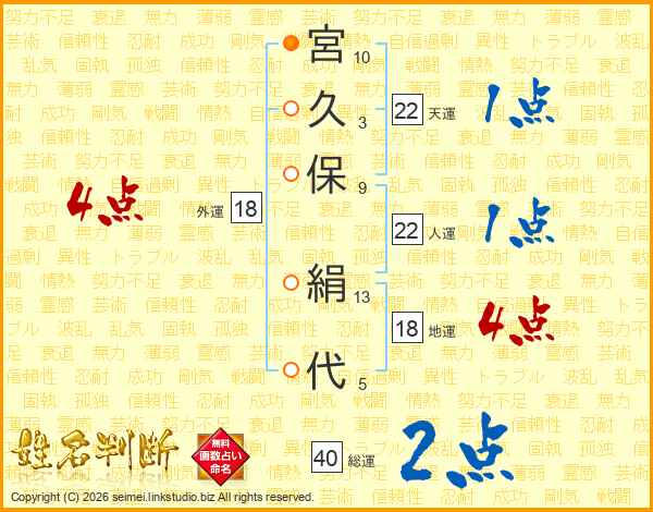 宮(10画)久(3画)保(9画) 絹(13画)代(5画)