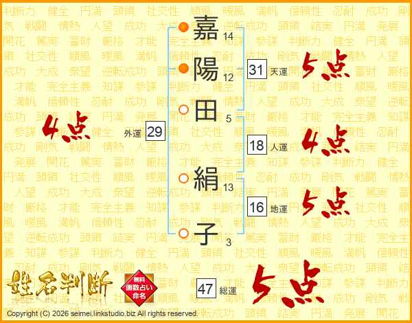 嘉(14画)陽(12画)田(5画) 絹(13画)子(3画)
