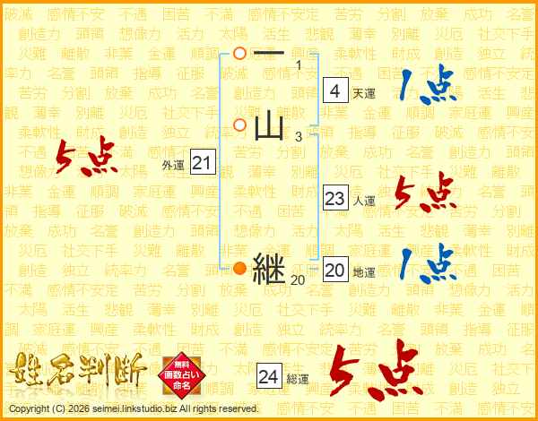 生活面を象徴する運勢です。外部から受ける影響力を表し、結婚運、家庭運や職場、環境への順応性を表します。総運から人運を引いた画数。姓や名が1文字の場合を除く。
