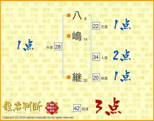 生活面を象徴する運勢です。外部から受ける影響力を表し、結婚運、家庭運や職場、環境への順応性を表します。総運から人運を引いた画数。姓や名が1文字の場合を除く。