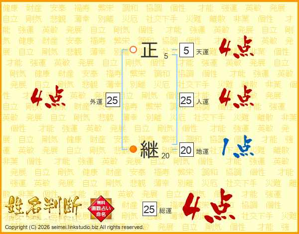 生活面を象徴する運勢です。外部から受ける影響力を表し、結婚運、家庭運や職場、環境への順応性を表します。総運から人運を引いた画数。姓や名が1文字の場合を除く。