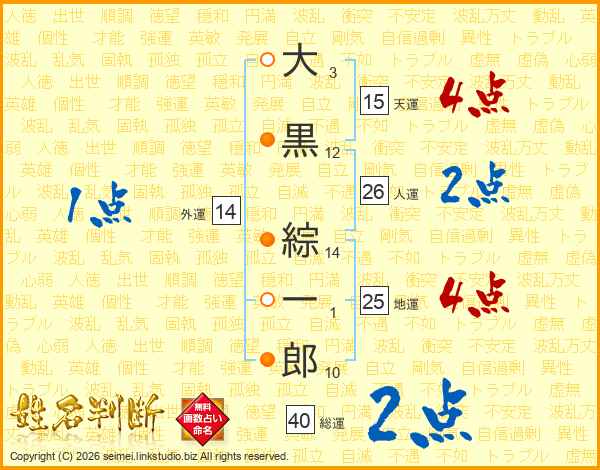 大(3画)黒(12画) 綜(14画)一(1画)郎(10画)