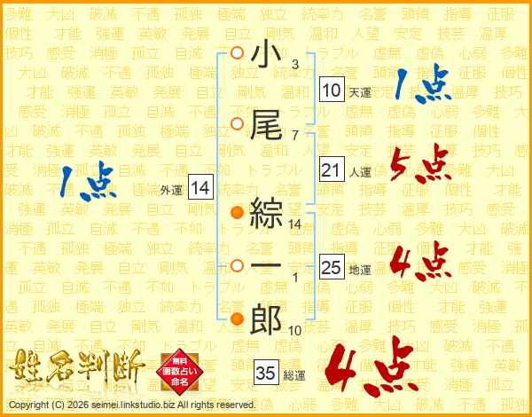 小(3画)尾(7画) 綜(14画)一(1画)郎(10画)