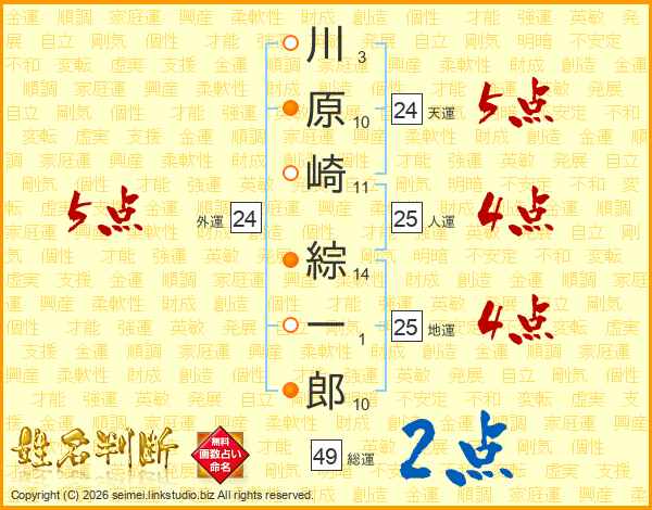 川(3画)原(10画)崎(11画) 綜(14画)一(1画)郎(10画)