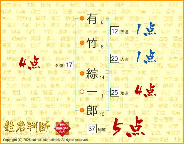 有(6画)竹(6画) 綜(14画)一(1画)郎(10画)
