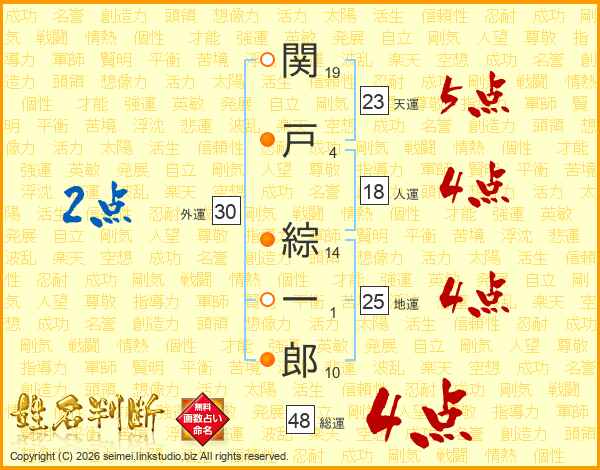 関(19画)戸(4画) 綜(14画)一(1画)郎(10画)