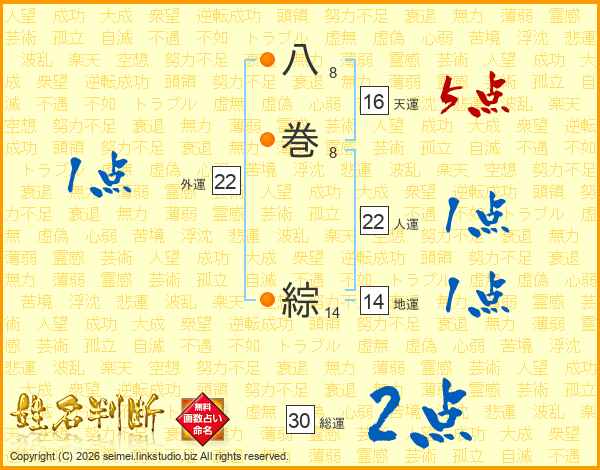 あなたの人生を表す1番重要な運勢です。生涯を通じて影響する総合運となり、主に50歳以降の晩年期に影響を及ぼします。苗字と名前の合計画数。
