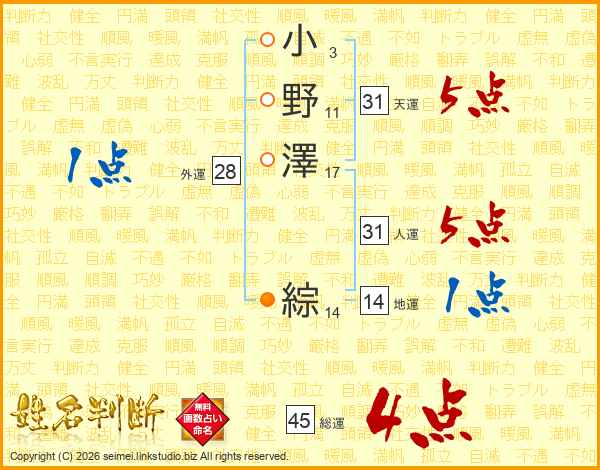 生活面を象徴する運勢です。外部から受ける影響力を表し、結婚運、家庭運や職場、環境への順応性を表します。総運から人運を引いた画数。姓や名が1文字の場合を除く。