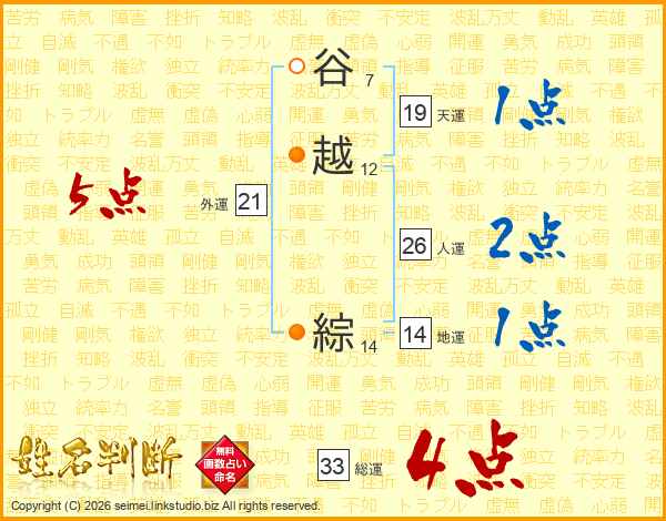 生活面を象徴する運勢です。外部から受ける影響力を表し、結婚運、家庭運や職場、環境への順応性を表します。総運から人運を引いた画数。姓や名が1文字の場合を除く。