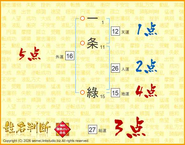 あなたの人生を表す1番重要な運勢です。生涯を通じて影響する総合運となり、主に50歳以降の晩年期に影響を及ぼします。苗字と名前の合計画数。