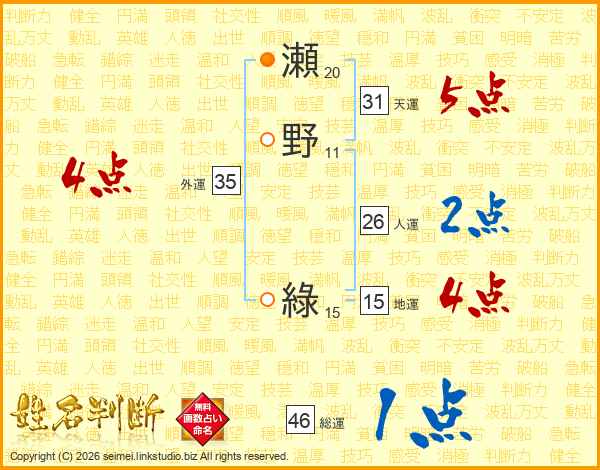 瀬野綠さんの総運は46画の1点!