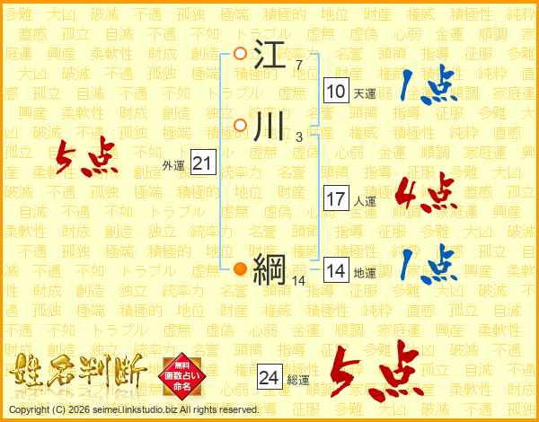 生活面を象徴する運勢です。外部から受ける影響力を表し、結婚運、家庭運や職場、環境への順応性を表します。総運から人運を引いた画数。姓や名が1文字の場合を除く。
