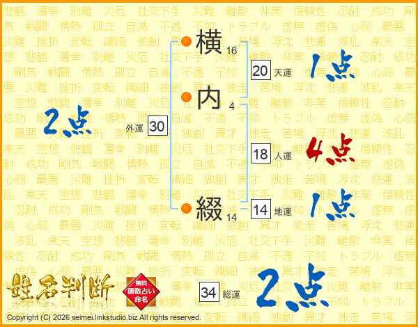 生活面を象徴する運勢です。外部から受ける影響力を表し、結婚運、家庭運や職場、環境への順応性を表します。総運から人運を引いた画数。姓や名が1文字の場合を除く。