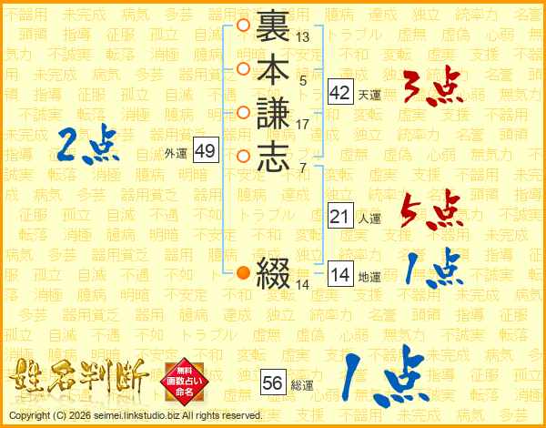裏本謙志綴さんの総運は56画の1点!