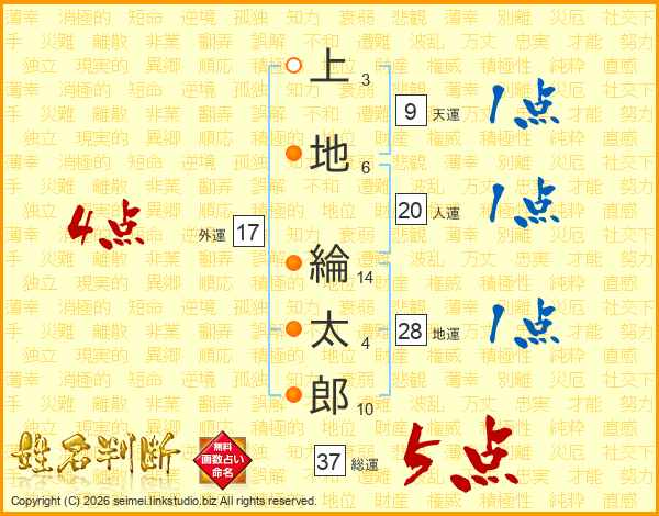 上(3画)地(6画) 綸(14画)太(4画)郎(10画)