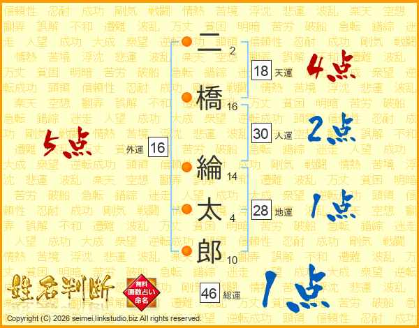 二(2画)橋(16画) 綸(14画)太(4画)郎(10画)