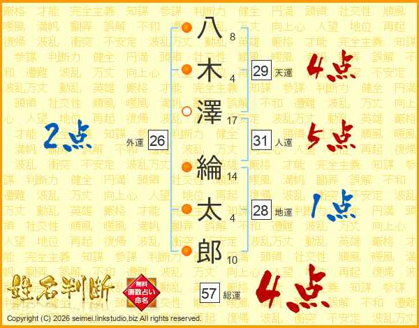 八(8画)木(4画)澤(17画) 綸(14画)太(4画)郎(10画)