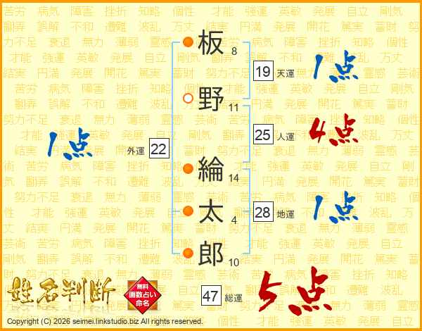 板(8画)野(11画) 綸(14画)太(4画)郎(10画)