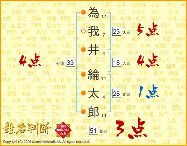 為(12画)我(7画)井(4画) 綸(14画)太(4画)郎(10画)